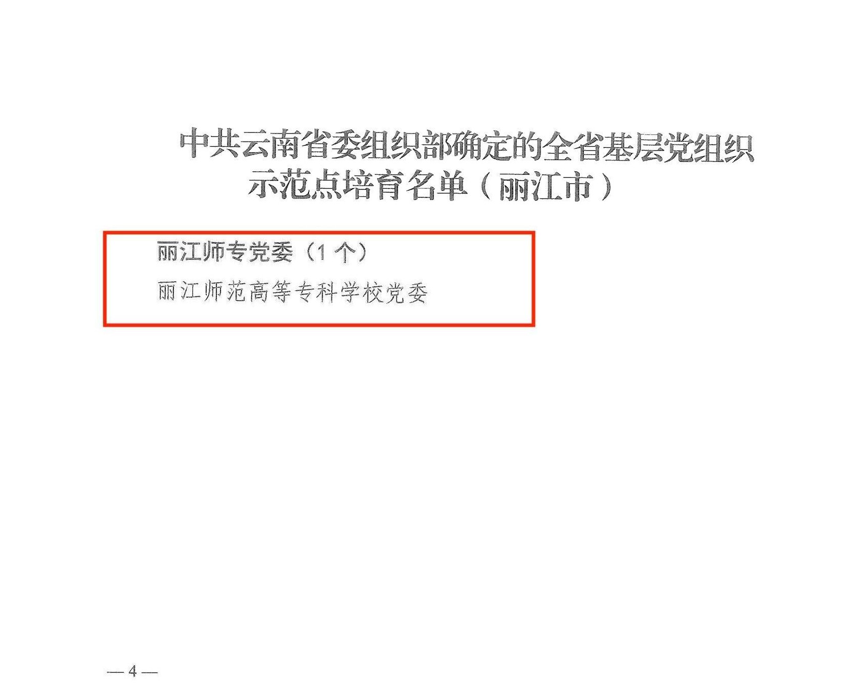 近日,中共丽江市委组织部下发《关于印发省委组织部确定的全省基层党组织示范点培育名单(丽江市)的通知》,全市27个党组织被省委组织部确定为全省基层党组织示范点培育名单,学校党委入选。
